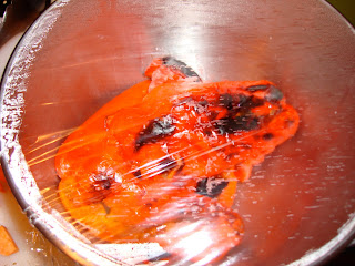 1. Preheat boiler. Place red peppers cut side down on baking sheets. Lightly coat the outside of each pepper with olive oil. Place baking sheet in broiler and cook until skins blacken (about 8-10 minutes). Remove from broiler and place all peppers in a large bowl. Cover tightly with plastic wrap. This will help the peppers sweat, which loosen the skins. Wait about 15 minutes until the peppers are cool and gently remove the skins from each.