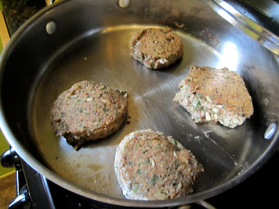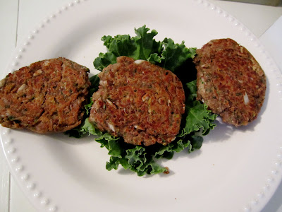 Place the flax seeds and water in a small bowl. Let sit for 10 minutes so it becomes a gel. Put the 3 types of beans in the food processor and puree. Add the kale, parsley, red onion, garlic and diced tomatoes to the processor and combine with the beans. You may have to scrape down the sides a couple of times. Transfer to a large bowl. Add the flax “eggs” and stir. Add the sunflower seeds. Slowly add in the flour, adding 1/2 at first and then mixing and then adding the remaining flour. Then add the balsamic vinegar, red pepper flakes, black pepper and salt. Spray olive oil in a frying pan and heat on a medium flame. Form 6 burgers with the mixture. Cook for about 4 minutes on each side. After burgers are flipped to the other side and browned, cover for the remainder of the time.