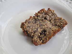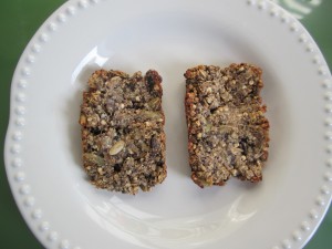 Preheat oven to 350 degrees. Mix together all dry ingredients in a large mixing bowl, leaving out the baking powder. Then add all wet ingredients (almond butter, agave nectar, honey) and mix together well. The mixture will seem dry, but keep mixing until all ingredients come together. Spoon mixture either in a 13×9 pan or use a mini loaf pan. Let bake for 15 minutes. Remove from oven and let sit for 5 minutes before you remove from pan. Once removed, let cool on a cooling rack. Makes about 16 granola bars.