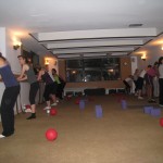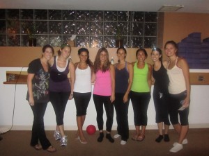 After we went into the class, we got set up with light hand weights and a strap. I grabbed 3 and 4 pound weights. We started off with some pushups and then went into some arm exercises. We did a variety of pushups, even using the red ball for some of them. (One hand on floor, one hand on red ball.) Laurie, the instructor, told us we should grab what we were comfortable with. Right away I liked Laurie because she was friendly but I could tell she was tough and meant business. I started with the 3 pound weights to be safe, but ended up switching to the 4 about half way through. I tried to be conservative with the weight, but now I know I can handle the 4 pound weights. The exercises definitely made my arms BURN by the end…or half way through. We did things with high reps of shoulder raises, kickbacks and curls. When we were done with arms, we moved onto torturous legs.